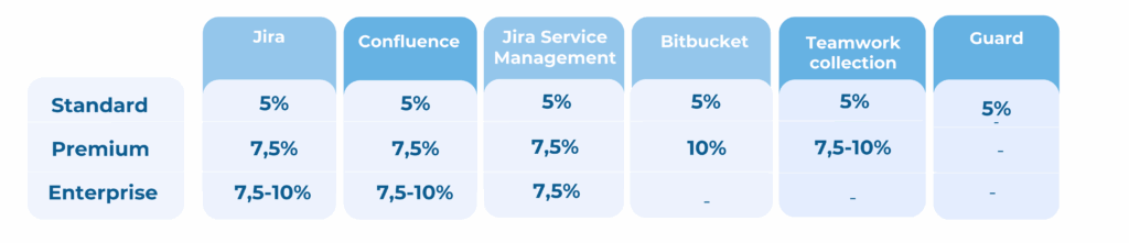 - Jira, Confluence, and Jira Service Management across Standard, Premium, and Enterprise plans