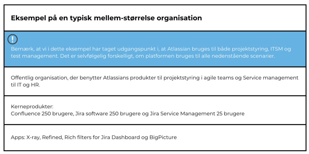 | Bemærk at vi i denne organisation har taget udgangspunkt i, at Atlassian bruges til både projektstyring, ITSM og test management. Det er selvfølgelig forskelligt, om platformen bruges til alle nedenstående scenarier. |